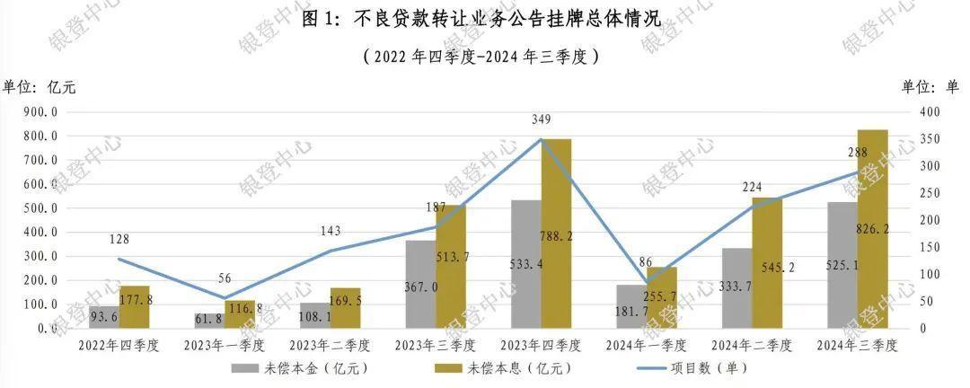 银登中心此前发布的2024年三季度不良贷款转让业务统计数据显示,今年前三季度,不良贷款转让项目数共计598单,较去年同期增加了54.9%。金额方面,前三季度挂牌转让的不良贷款本息合计1627.1亿元,是去年同期的两倍。